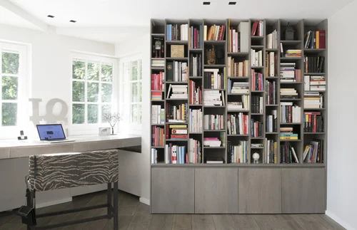 Bibliothèque déstructurée. Menuiseries réalisées en placage chêne épais, grisé en atelier. Parquet en chêne massif grisé et brossé. Prises interrupteurs et plaques : finition canon de fusil. Encastrés Kréon.