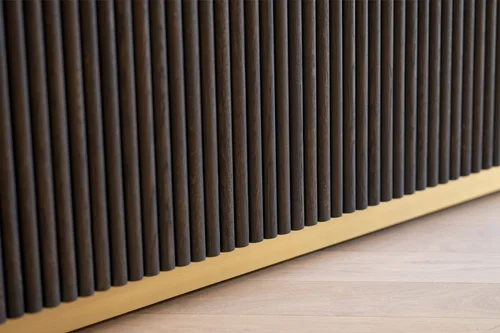 Home cinéma en chêne massif. L’habillage intègre des espaces de rangement invisibles de part et d’autre de l’écran de projection.